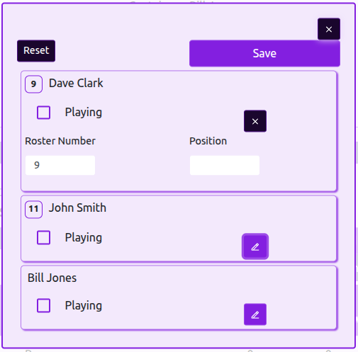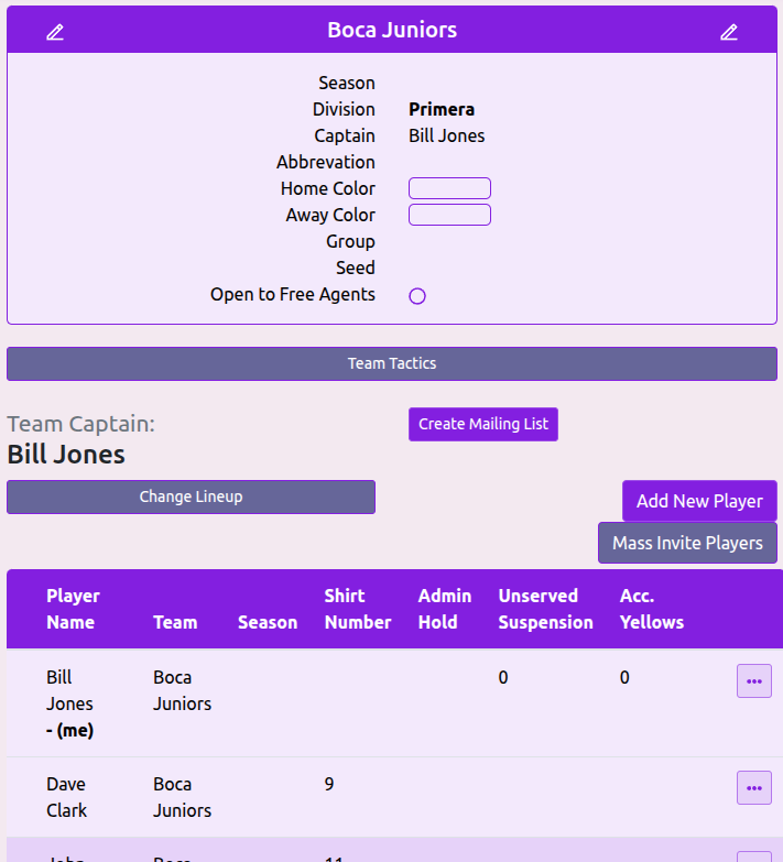 Team lineups are used by match officials and scorekeepers to track which players are participating in a game. A lineup includes a Playing / Not Playing status for each player, along with optional shirt or roster number and field position details. Team captains can set a default lineup for all matches and override it on a per-match basis when needed. Lineups can only be edited before the match starts; once a match is in progress, only match officials can make changes.